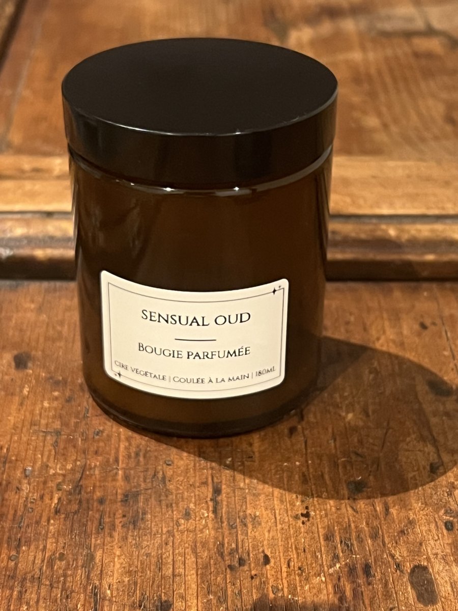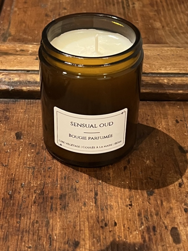 Cire mélange d'huile de colza et d'huile de coco. Mèche en coton. Huile parfumée Oud, connu sous le nom de bois d'Agar (contient de l'alpha-isométhyl ionone, du cinnamaldéhyde, de l'alcool cinnamique, de la coumarine, du limonène, de l'absolue de mousse de chêne, du pentadécalactone et de l'alpha-pinène. Peut provoquer des réactions allergiques.)